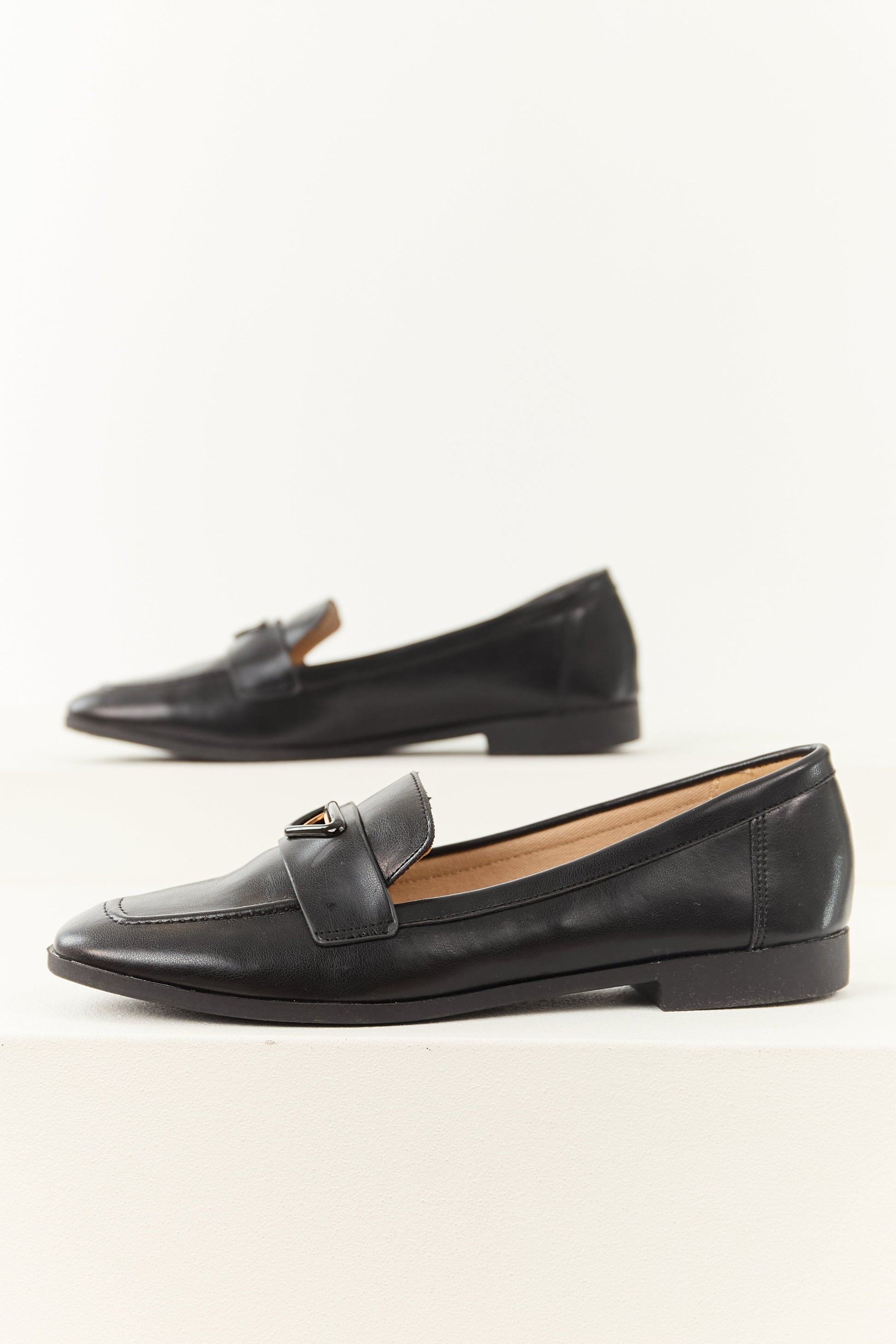- Classic gets a sharp update — these black faux leather loafers feature a sleek triangle detail for a modern edge.