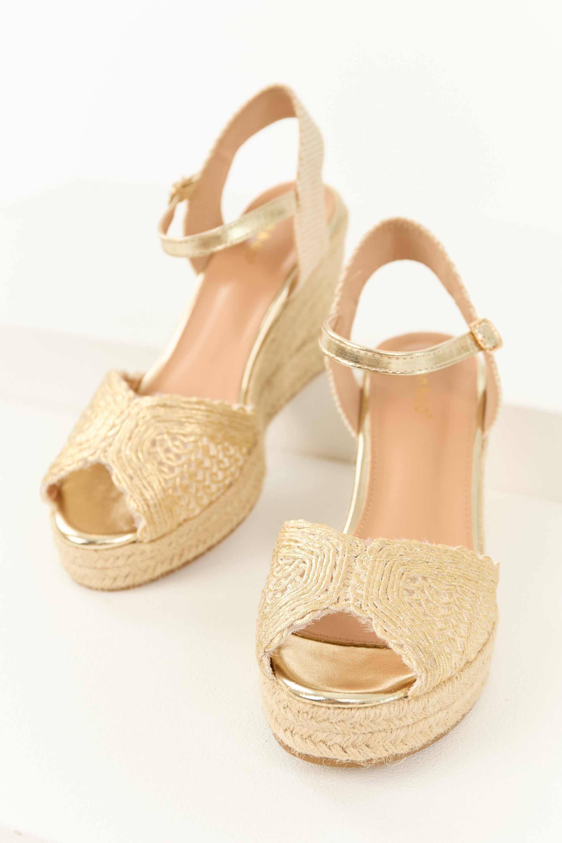 Gold Metallic Coated Crochet Strap Espadrille Wedges
